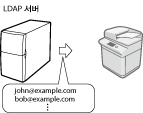 LDAP(Lightweight Directory Access Protocol) 서버를 사용하여 네트워크의 디렉토리 리스트에서 수신인을 지정할 수 있습니다. 그런 다음 주소를 수신인으로 지정하거나 주소록에 등록할 수 있습니다.