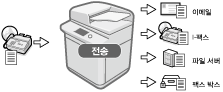 원하는 송신 설정을 사용하여 지정된 전송 조건과 일치하는 수신된 I-팩스 문서를 임의의 수신인에게 기기가 자동으로 전송하도록 설정할 수 있습니다. 수신된 I-팩스 문서를 다른 기기로 전송하거나(릴레이 기능) 팩스 박스에 저장할 수 있습니다. 지정된 시간에 활성화되도록 자동 전송을 설정할 수도 있습니다. 전송 조건에 맞지 않는 수신된 문서도 원하는 수신인에게 전송할 수 있으므로 이 기능을 사용하여 수신된 I-팩스 문서를 정렬하고 해당 수신인에게 전달할 수 있습니다.