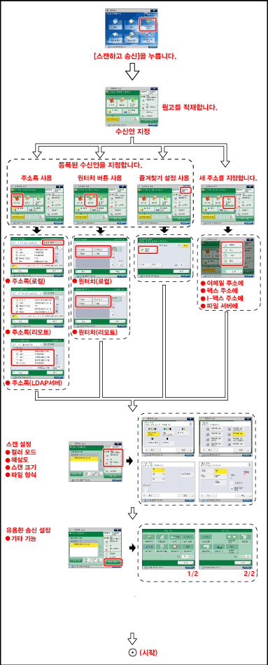 스캔한 문서를 이메일 주소, I-팩스 주소 또는 파일 서버로 송신하려면 네트워크 설정을 지정해야 합니다. (See "이메일/I-팩스 공통 통신 설정.")