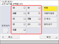 다음과 같은 종류의 원고를 스캔하는 경우에는 [자동]을 선택할 수 없습니다. 원하는 스캔 크기를 선택합니다.
