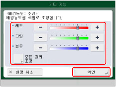 레드, 그린 및 블루를 개별적으로 조정하려면 [컬러별 조정]을 누릅니다. [-] 또는 [+]를 눌러 각 컬러의 농도를 조정하고 → [확인]을 누릅니다.