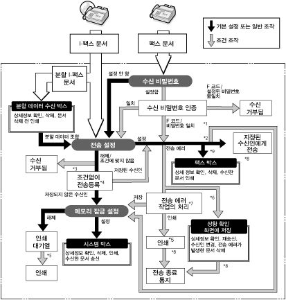 *9 또한 전송처로 지정하여 팩스 박스에 수신된 팩스/I-팩스 파일을 저장할 수 있습니다. 지정된 전송 조건과 일치하는 수신된 파일만 팩스 박스에 저장됩니다.