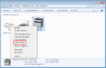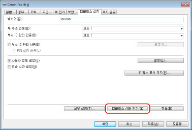 공유 프린터를 사용하는 경우 [디바이스 상태 얻기] 기능을 사용하려면 인쇄 서버 컴퓨터에 Canon Driver Information Assist Service를 설치해야 합니다. Canon Driver Information Assist Service 설치 방법에 대한 자세한 내용은 팩스 드라이버 설치 설명서를 참고하십시오("설치" 참고).
