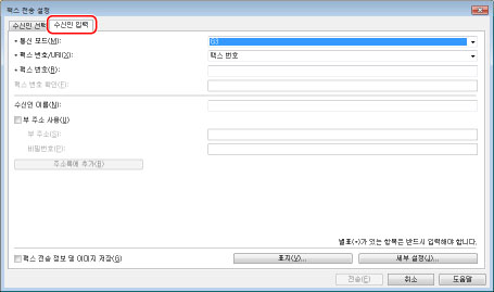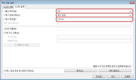 각 통신 모드에 외부 회선 전화 걸기 국번을 설정할 수 있습니다. [통신 모드]를 설정하려면 [디바이스 설정] 탭의 연결 환경과 일치하도록 통신 모드를 정확히 설정해야 합니다. 정확히 설정하지 않으면 잘못된 전송 및 전송 오류가 발생할 수 있습니다.
