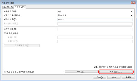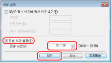 [세부 설정] 대화상자에서 [전송 시간 설정]을 선택하고 → 팩스를 전송할 시간을 지정한 다음 → [확인]을 클릭합니다.