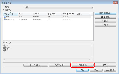 [기타] 탭 - [보안 설정] - [주소 목록을 내보낼 때 암호로 보호]의 [보안 설정] 대화 상자에서 [주소 목록을 내보낼 때 암호로 보호]를 선택한 경우 [내보내기]를 클릭하면 암호 입력 대화상자가 표시됩니다. 자세한 내용은 도움말을 참고하십시오("도움말 보기" 참고).