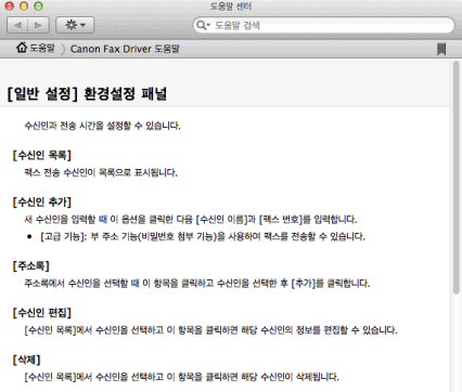 도움말에는 각 팩스 기능에 대한 추가 정보가 포함됩니다. 필요한 정보가 전자 설명서에 나와 있지 않으면 도움말을 참고하십시오.
