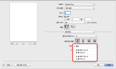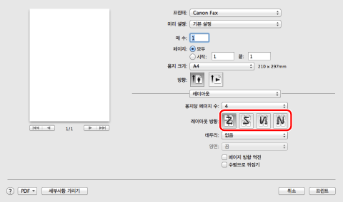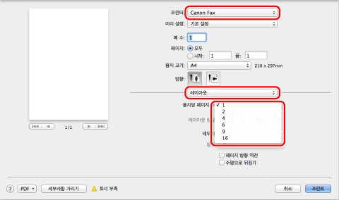 팩스를 선택하고 → [레이아웃]을 클릭한 후 → [용지당 페이지 수]에서 용지 한 장에 출력할 페이지 수를 선택합니다.