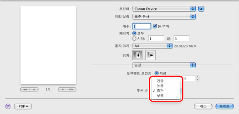 전송 우선 순위를 [긴급], [높게], [중간], [낮게] 중에서 선택합니다.