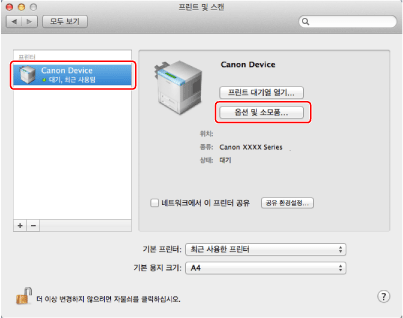 사용 중인 팩스를 선택하고 → [옵션 및 소모품]을 클릭합니다.