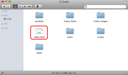 [FAX] 폴더에서 [Documents] → [korean] → [Guide] → "index.html" 아이콘을 두 번 클릭합니다.