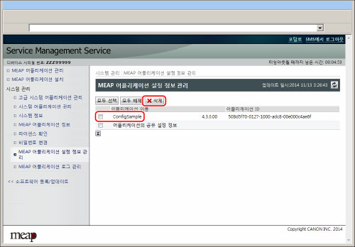 삭제할 MEAP 응용프로그램을 선택하고 → [삭제]를 클릭합니다.