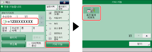 수신인을 지정하고 → [기타 기능]을 누른 다음 → [송신결과 리포트]를 누릅니다.