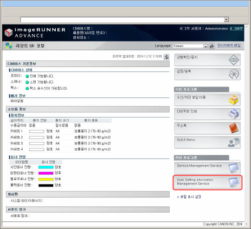 사용자 설정 정보 관리 서비스 페이지를 사용하려면 [환경 설정](설정/등록)에서 [HTTP 사용]을 '설정'으로 지정합니다. (See "TCP/IPv4 및 TCP/IPv6의 공통 설정.")