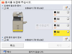 인쇄 중에 용지를 넣으라는 메시지가 나타나는 경우, 적절한 용지를 넣은 후에 잔여 인쇄가 자동으로 수행됩니다. 다른 용지 카세트를 선택한 경우, [확인]을 누른 후 나머지가 인쇄됩니다.