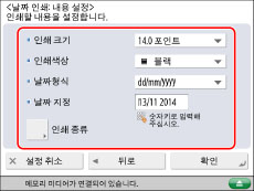 설정한 데이터가 없을 경우 [날짜/시각 설정]에서 설정한 데이터가 인쇄됩니다. [날짜/시각 설정] 설정이 맞는지 확인하십시오. (See "현재 날짜 및 시각.")