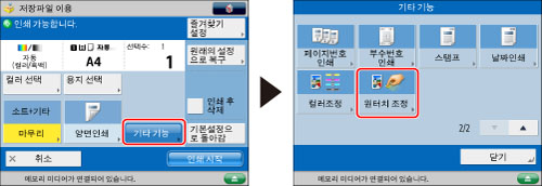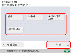 원터치 컬러 조정 모드 설정은 실제로 미리 설정된 컬러 조정 설정입니다. 그러므로 원터치 컬러 조정 모드 설정을 변경하는 경우 사용자가 설정한 컬러 조정 설정도 변경될 수 있습니다.