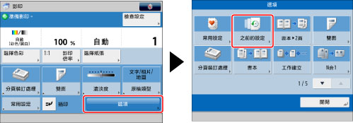 進行下列操作之前的影印設定被計為一個最近的影印設定︰若沒有將它們設定為單一設定,則無法使用[之前的設定]叫回這些設定。