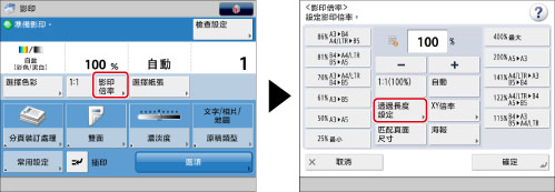 為原稿尺寸和影印尺寸選擇水平和垂直方向的影印倍率。