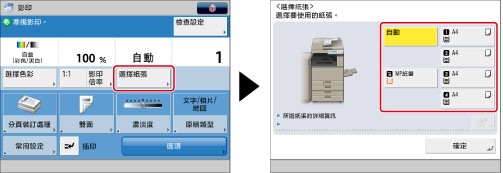 若「設定/註冊」的[功能設定]設定了[基於色彩紙匣自動選擇],根據影印時所選色彩模式,可以執行自動紙張選擇。(See "根據色彩指定紙匣自動選擇.")