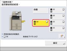 若預先將各個紙匣中要添加的紙張類型儲存到本機器中,則可以在紙張選擇螢幕上顯示指示各紙匣中添加的紙張類型的圖示。(See "註冊/編輯自訂紙張類型.")