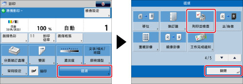將原稿放置到原稿台玻璃上。原稿放置在送稿機中時,不能使用[列印並檢查]進行影印。
