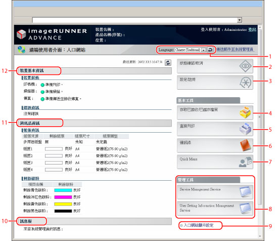 不管本機器觸控面板顯示螢幕上使用的是哪種語言,透過在入口網站頁面上選擇所需語言,可以變更螢幕上的顯示語言。