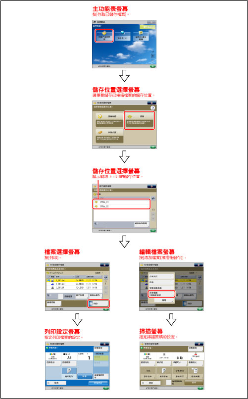 有關[添加檔案(掃描後儲存)]的操作步驟和操作「掃描」螢幕的說明,請參閱"添加檔案(掃描後儲存)"和"掃描後儲存操作流程."