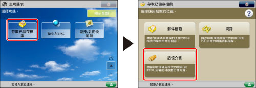 要使用記憶介質,必須將[儲存位置顯示設定]中的[記憶介質]設定為「開啟」。(See "儲存位置顯示設定.")