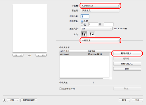 選擇傳真機 → [一般設定] → 按一下[新增收件人]。