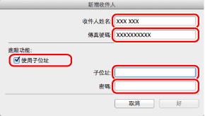 輸入在 [收件人姓名] 和 [傳真號碼] 中輸入的收件人姓名及傳真號碼 → 選擇 [使用子位址] → 輸入收件人傳真機記憶體的子位址及密碼。