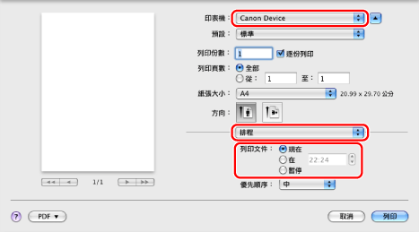 選擇傳真機 → [排程] → 從 [列印文件] 傳送文件的時間。