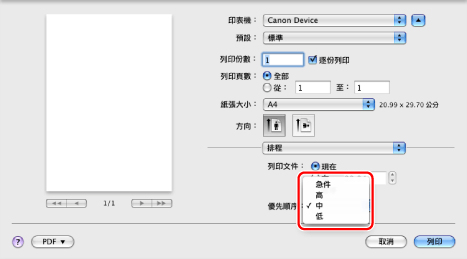 從 [急件]、[高]、[中] 及 [低] 中選擇傳送優先順序。