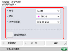 也可以選擇在[註冊頁碼編排/浮水印字元]中註冊的文字。(See "註冊/編輯/刪除頁碼和浮水印的使用者定義文字.")