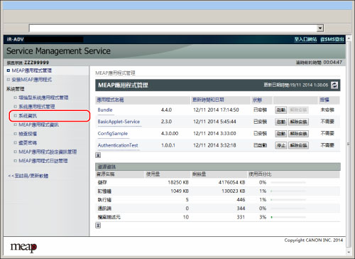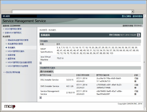 可以確認與平台(如Java虛擬機器)相關的版本資料,以及系統應用程式的版本資料、安裝日期、當前狀態等。