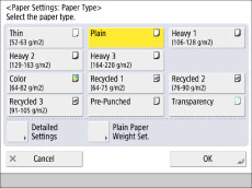 You can select the paper type from the simple or detailed setting screen. For paper types that are not displayed on the simple setting screen, press [Detailed Settings] → select the paper type from the detailed setting screen.