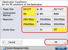 Set the destination conditions according to the specifications of the recipient's machine. If the paper size of the data to send is larger than the paper sizes that can be used with the recipient's device, the image may be clipped or cut off.