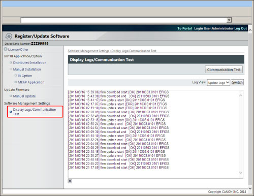 You can display the installation/update log from the touch panel display or the Remote UI.