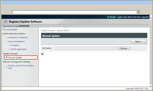 From the portal page of the Remote UI, click [Settings/Registration] → [License/Other] → [Register/Update Software].
