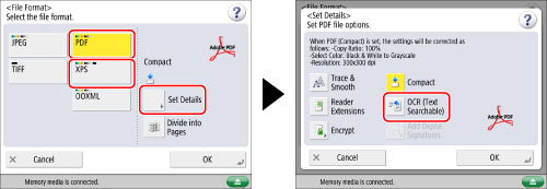 If you select [PDF] or [XPS] as the file format, you can set [Compact] and [OCR (Text Searchable)] at the same time.