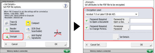 * Appears only if you select [Acrobat 9.0 or Equivalent] in [256-bit AES Settings for Encrypted PDF] in [Function Settings] (Settings/Registration). (See "Changing the PDF Encryption Level from Acrobat 10.0 or Equivalent to Acrobat 9.0 or Equivalent.")