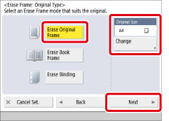This mode enables you to remove the shadows and lines that appear when scanning various types of originals. There are three types of Erase Frame: [Erase Original Frame], [Erase Book Frame], and [Erase Binding].