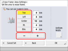 Specify the location of the binding holes → press [-] or [+] to set their respective erase frame widths.