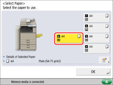 Icons indicating the type of paper loaded in each paper drawer can be displayed on paper selection screens, if you store that information into the machine beforehand. (See "Registering/Editing Custom Paper Types.")