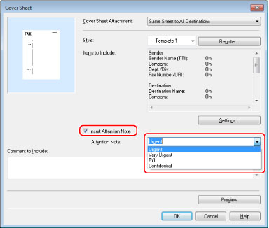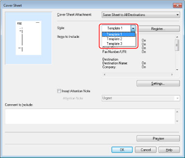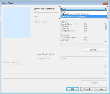 Select an option for attaching the cover sheet from [Cover Sheet Attachment] in the [Cover Sheet] dialog box.