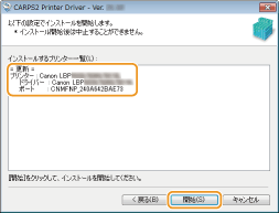 [インストールするプリンター一覧]でプリンターの情報を確認し、[開始]をクリックする