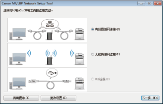 MF/LBP Network Setup Tool 实用工具可以按照屏幕上的说明配置初始网络设置。从用户软件 CD-ROM/DVD-ROM 安装打印机驱动程序时自动启动该工具。如果要单独手动启动,可从用户软件 CD-ROM/DVD-ROM 启动或从佳能网站下载的文件直接启动。