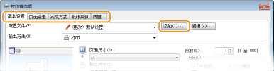 可根据需要在 [基本设置]、[页面设置]、[完成方式]、[纸张来源] 和 [质量] 选项卡上进行打印设置。