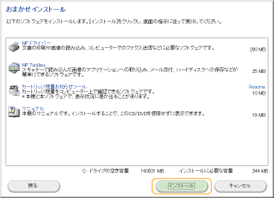 標準的なソフトウェアと電子マニュアルをインストールしたいときは、[おまかせインストール]をクリックしてください。