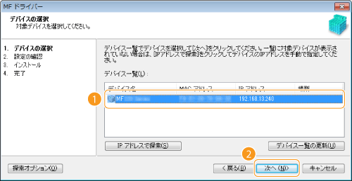 ネットワークの設定を確認する(電子マニュアル))、[デバイス一覧の更新]をクリックしてください。それでも本機がまったく表示されないときは、[IPアドレスで探索]